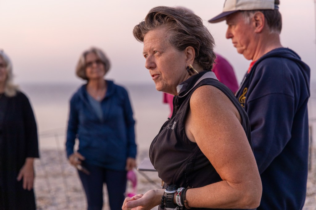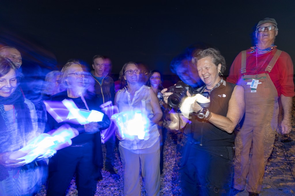 History buffs, artists and adventurers collaborated with artist Alina Wilczynski on the evening of October 4, creating unique public art–a light painting on the beach of Hallock Landing on the Long Island Sound. The framework was a 1901 shipwreck, the E Brush, a 60-foot schooner whose bones emerged briefly in 2018 before being reclaimed by the tides of the Sound. Yet this evening, volunteers were shown how to “paint” along a newly constructed framework with light using flashlights and colored lights in the public expo.